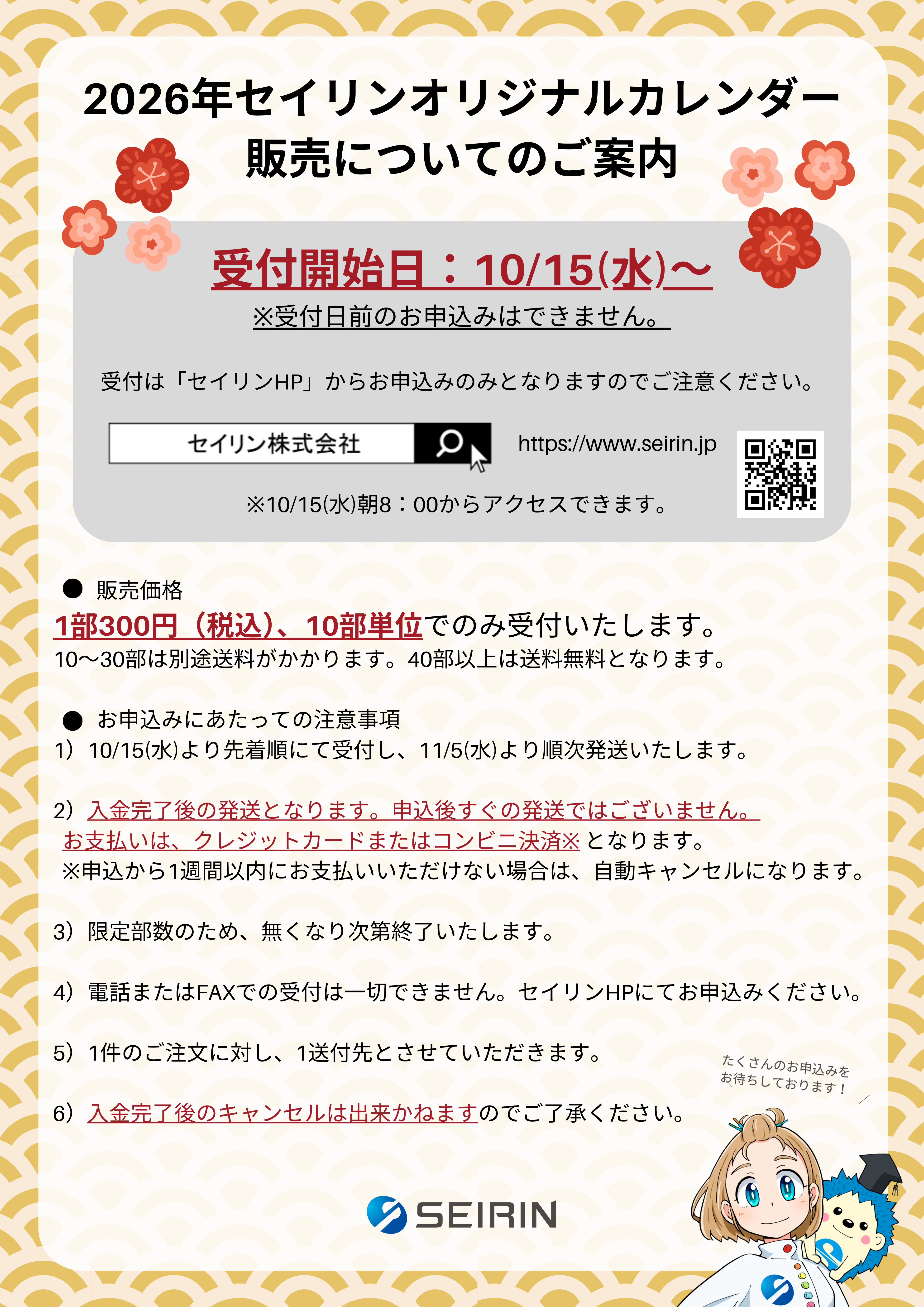 2026年セイリンオリジナルカレンダーの販売についてのご案内