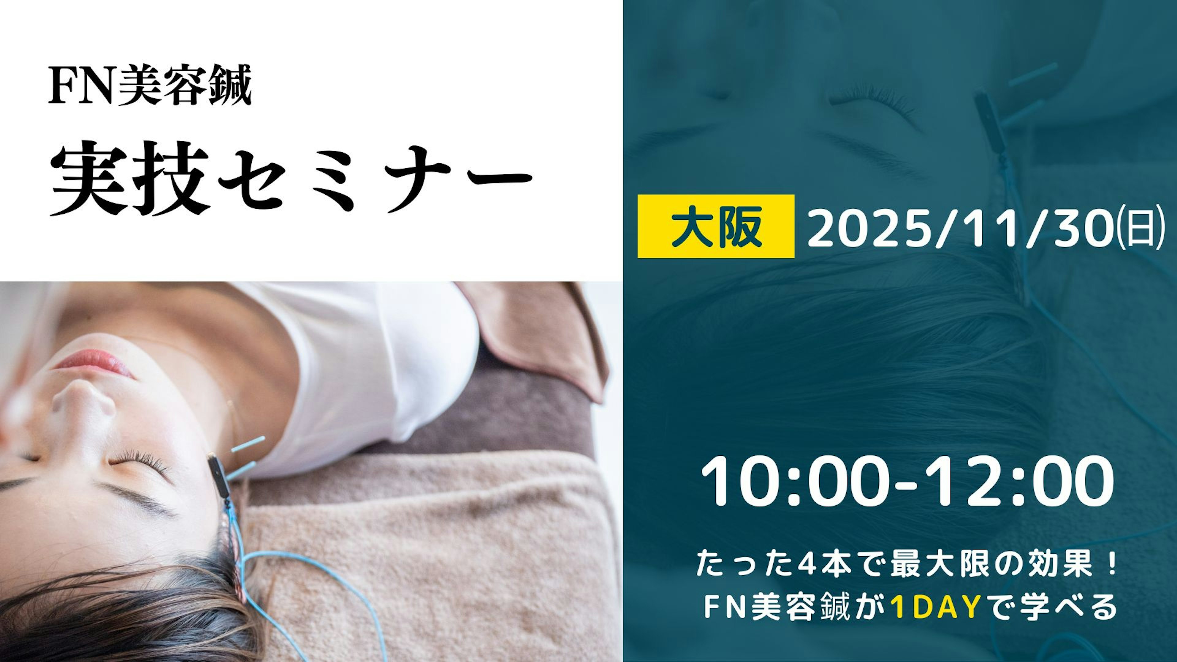 - 2025/11/30FN美容鍼 実技セミナー「たった4本で最大限の効果!」医学博士考案のFN美容鍼が1日で習得できます!大阪府外部その他