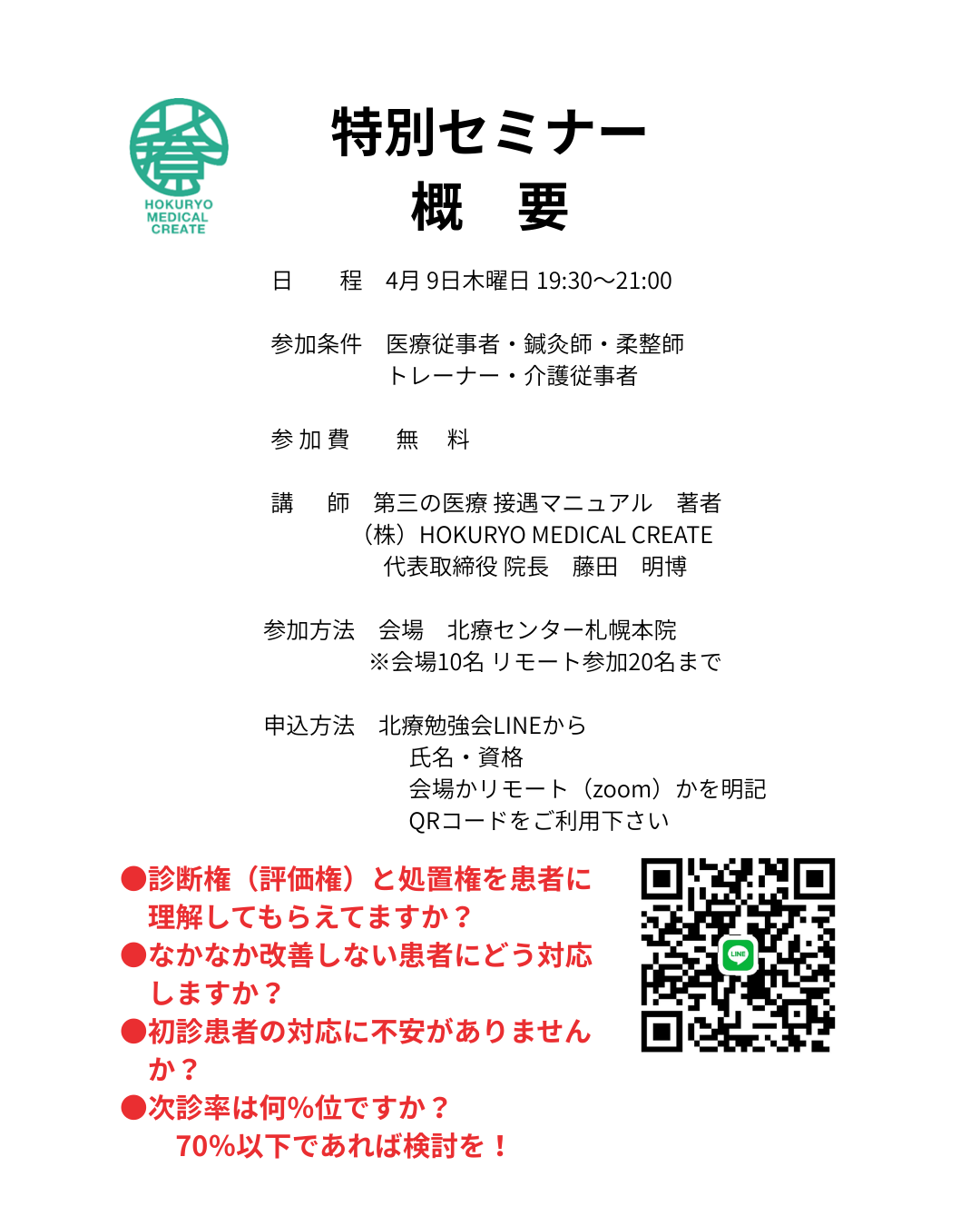 公式HP(申込み) | 北療勉強会LINEから 氏名・資格・会場かリモート(Zoom)かを明記してください。 |