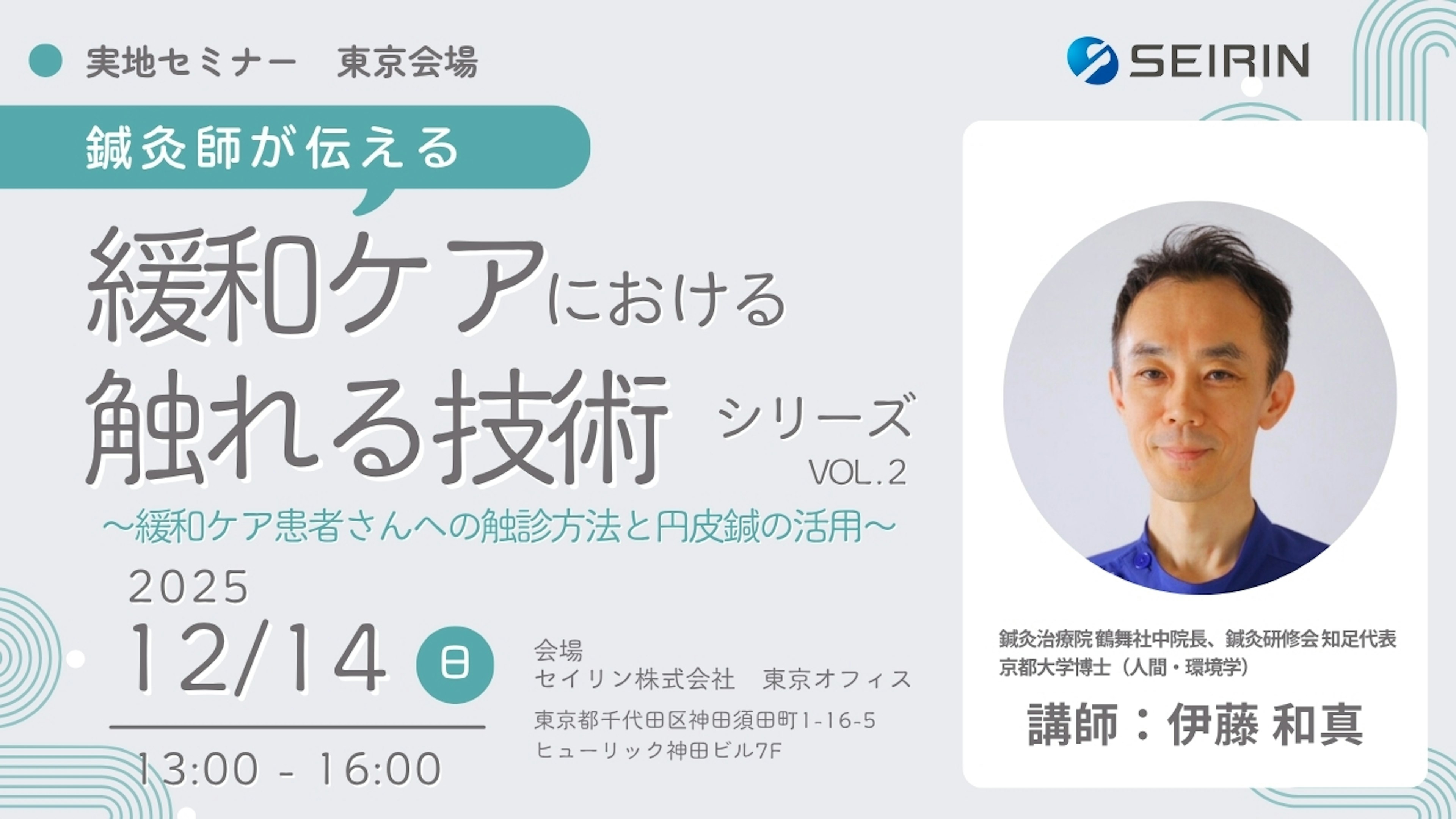 - 2025/12/14「鍼灸師が伝える緩和ケアにおける触れる技術」シリーズ VOL.2 基礎編in東京~緩和ケアにおける触れる技術と円皮鍼の使用用途~東京都伊藤 和真主催その他